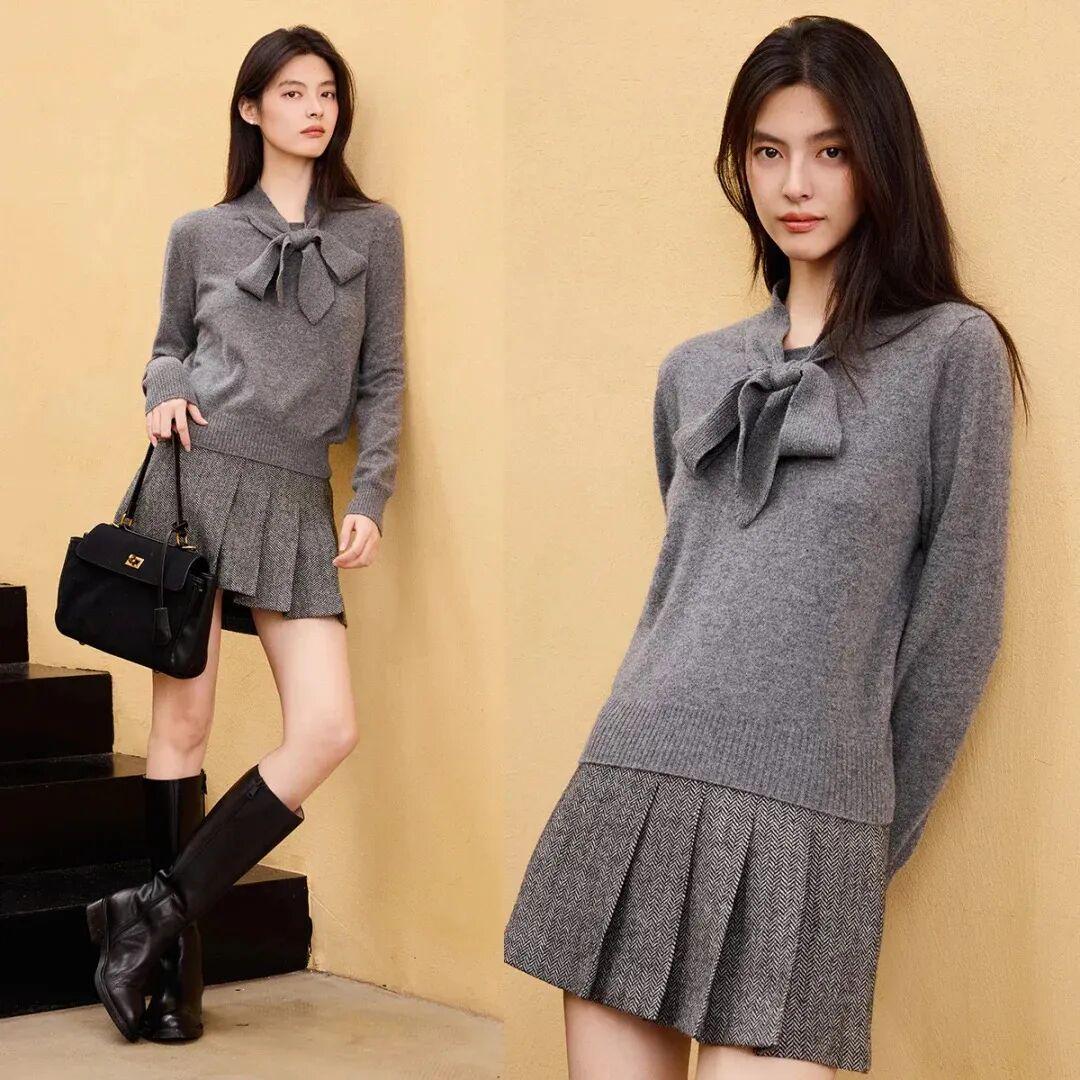 对于喜欢俏皮温柔风格的女生来说,灰色同样能打造出令人眼前一亮的穿搭。选一件灰色自带蝴蝶结装饰的毛衣,搭一条灰色百褶裙,整个人看起来青春洋溢又不失帅气。再搭上一双乐福鞋和中筒袜,整体层次分明,气场全开。