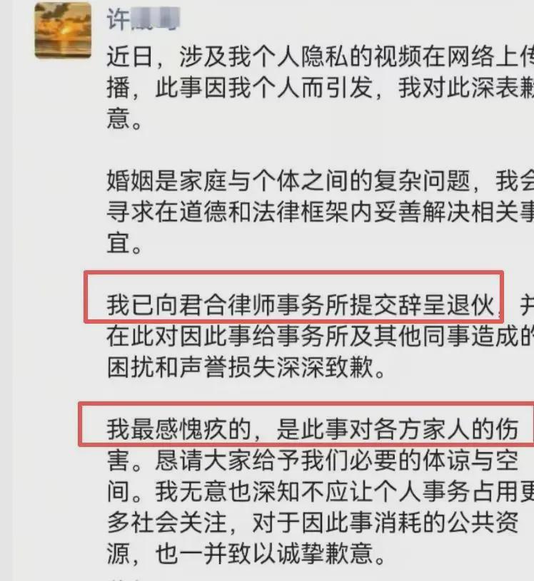11月3日,许某疑似在朋友圈发布道歉声明,承认因自己引发风波并已辞职。但全文仅对小三表示愧疚,对妻子和孩子只字未提。这种“选择性道歉”彻底激怒网友:“真正受伤的是家人,他却只关心小三?”