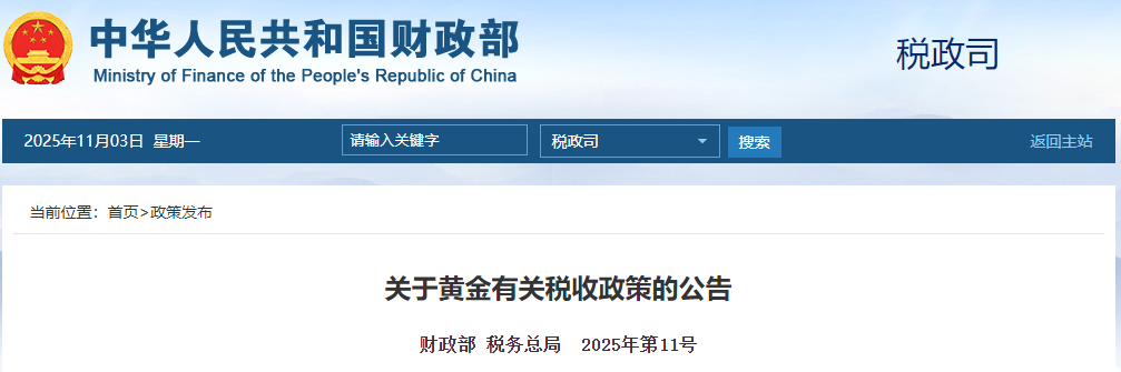 消息面上,11月1日,财政部、国家税务总局发布《关于黄金有关税收政策的公告》,明确黄金交易相关税收政策。公告称,会员单位或客户通过上海黄金交易所、上海期货交易所交易标准黄金,卖出方会员单位或客户销售标准黄金时,免征增值税。未发生实物交割出库的,交易所免征增值税;发生实物交割出库的,按照规定适用增值税政策。
