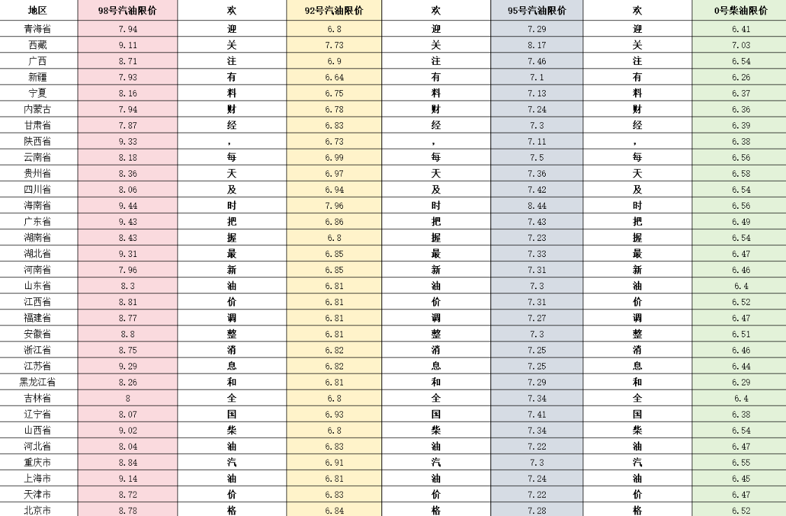 最新油价调整后,31个省区市柴油汽油最高零售价格表已发布,以下为部分地区油价参考数据: