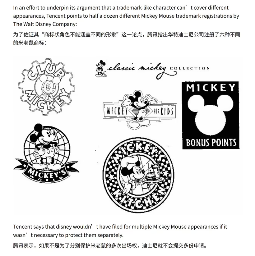为进一步强化论点,腾讯罕见地援引了迪士尼“米老鼠”的案例。腾讯辩称,一个角色在电影中是否可被识别,并不等于该角色改变外观后仍能作为单一商标。