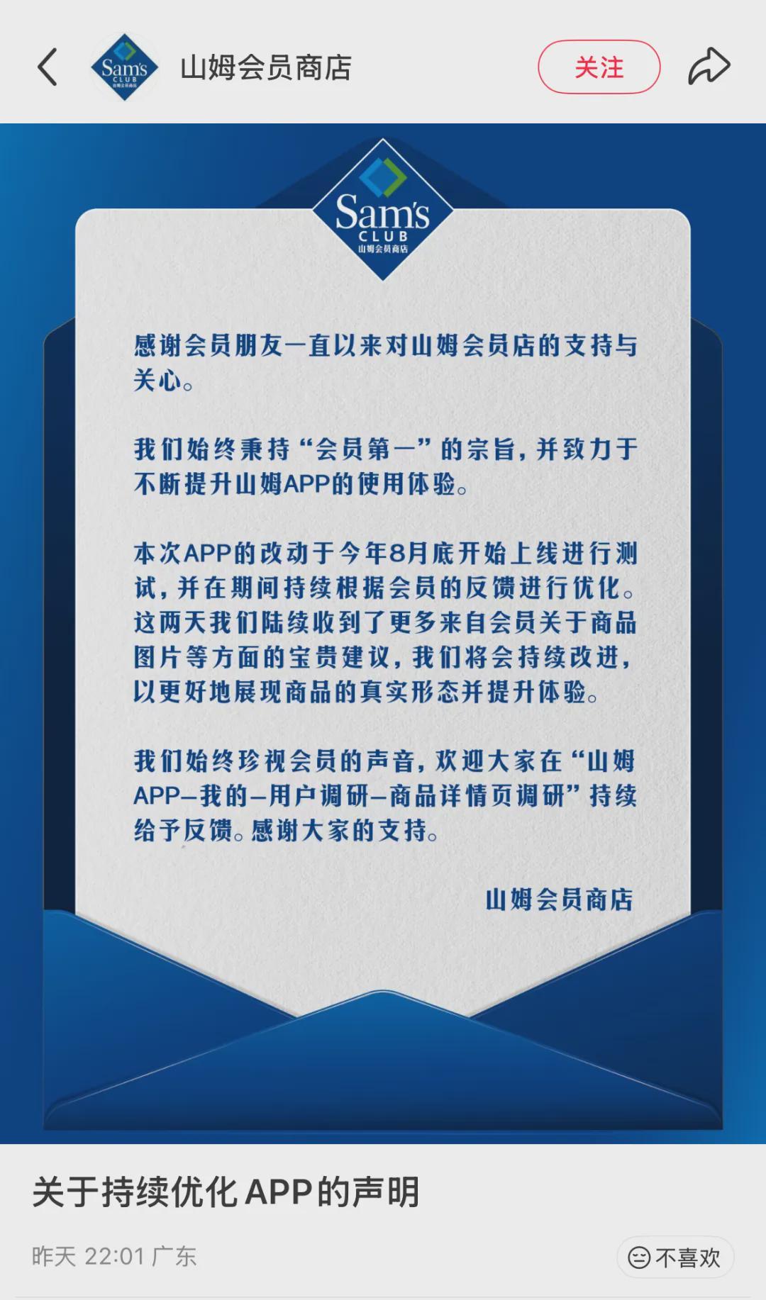 在山姆的社交媒体和App评论区,“退卡、差评”等类似的评论正在持续刷屏。面对消费者的质疑和不满,11月3日晚,山姆发文回应APP改版争议,表示将会持续改进,以更好地展现商品的真实形态并提升用户体验。