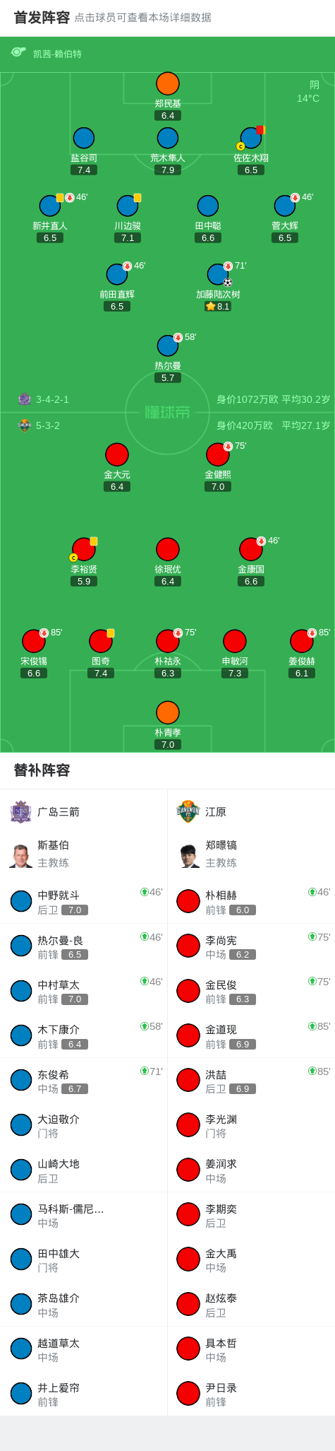 从赛后技术统计来看,广岛三箭在控球率(58%-42%)和射门次数(12-8)上均占据优势,但江原的射正次数(4次)与主队持平,显示出较强的进攻效率。少一人作战后,广岛三箭通过收缩防线、快速反击的策略成功限制了对手的进攻空间,最终保住胜果。