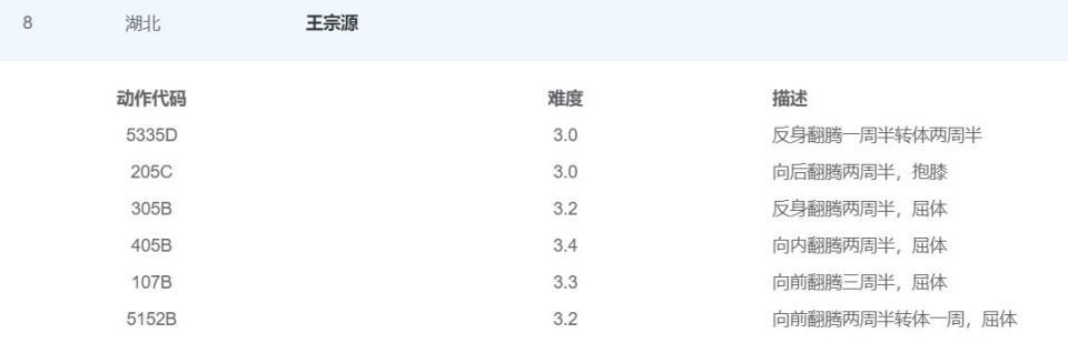 第二组动作,王宗源选择205C,表现稳健,单跳成绩72.00分,排名第3位;郑九源的5152B则获得76.80分。两轮过后,郑九源以0.30分的微弱优势反超王宗源。