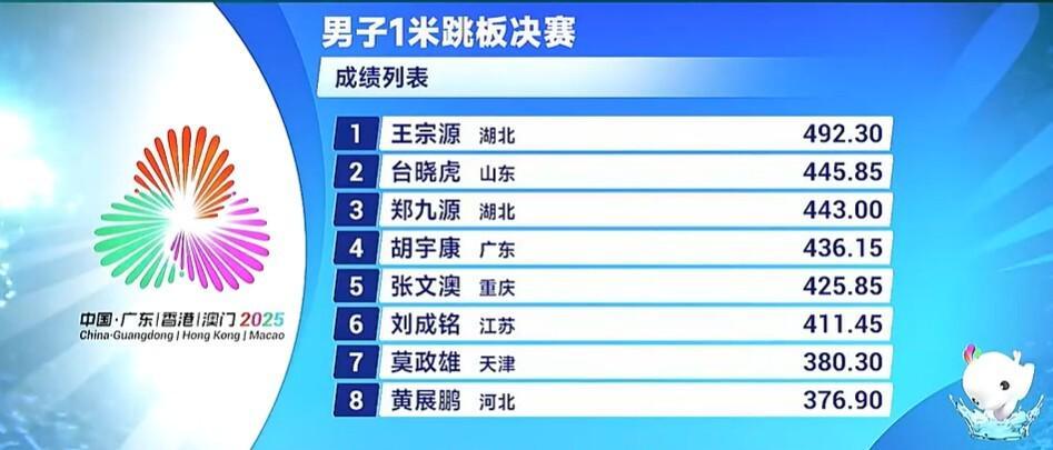 11月4日,第十五届全运会跳水男子1米板决赛如期举行。由奥运会冠军王宗源和世锦赛冠军郑九源领衔的湖北队,在该项目上展现了强大的实力。最终,王宗源以492.30分的绝对优势摘得金牌,领先第二名多达46.45分;郑九源则以443.00分获得铜牌;山东队选手台晓虎以445.85分收获银牌。