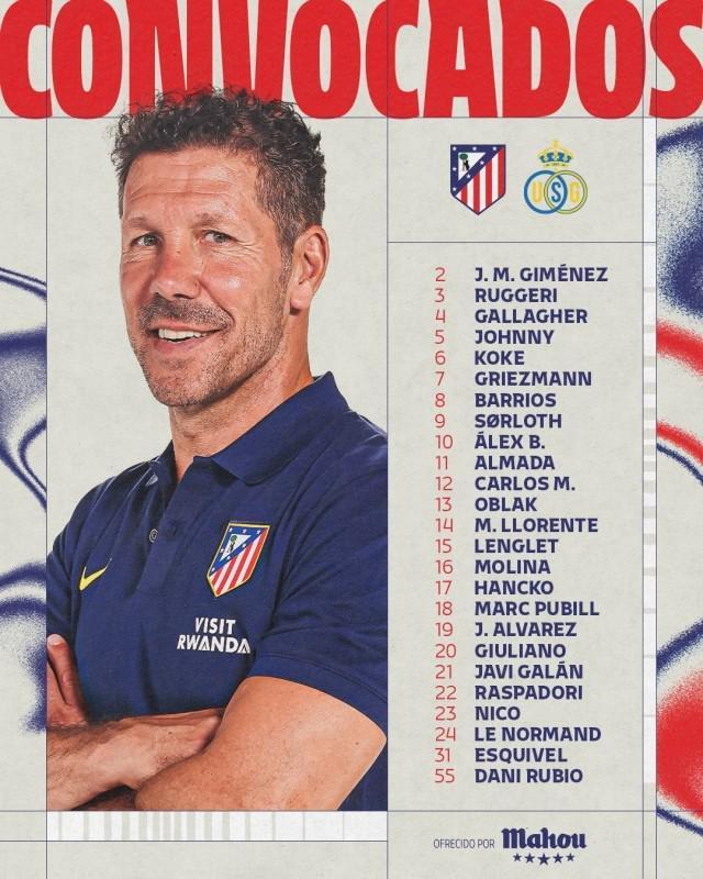 欧冠联赛阶段第4轮,马德里竞技将客场挑战圣吉勒斯联。床单军团已正式公布本场比赛大名单,胡利安·阿尔瓦雷斯(蜘蛛)、格列兹曼(格子)两大锋线核心领衔出征,奥布拉克坐镇门将位置,阵容实力备受期待。