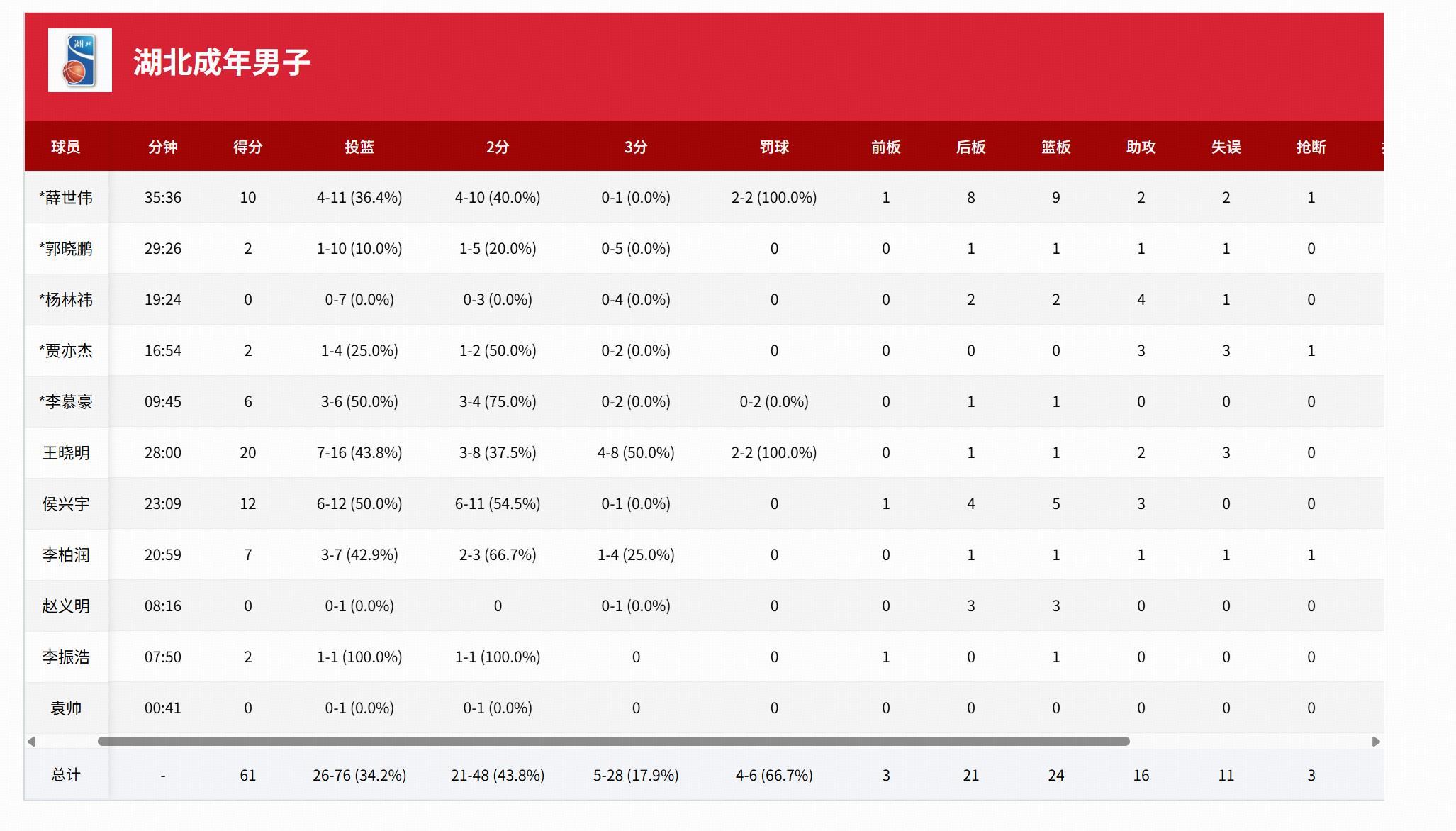 湖北男篮方面,王晓明得到全队最高的20分1篮板2助攻,侯兴宇贡献12分5篮板3助攻,薛世伟拿下10分8篮板2助攻,李柏润得到7分1助攻,李慕豪则有6分1篮板入账。