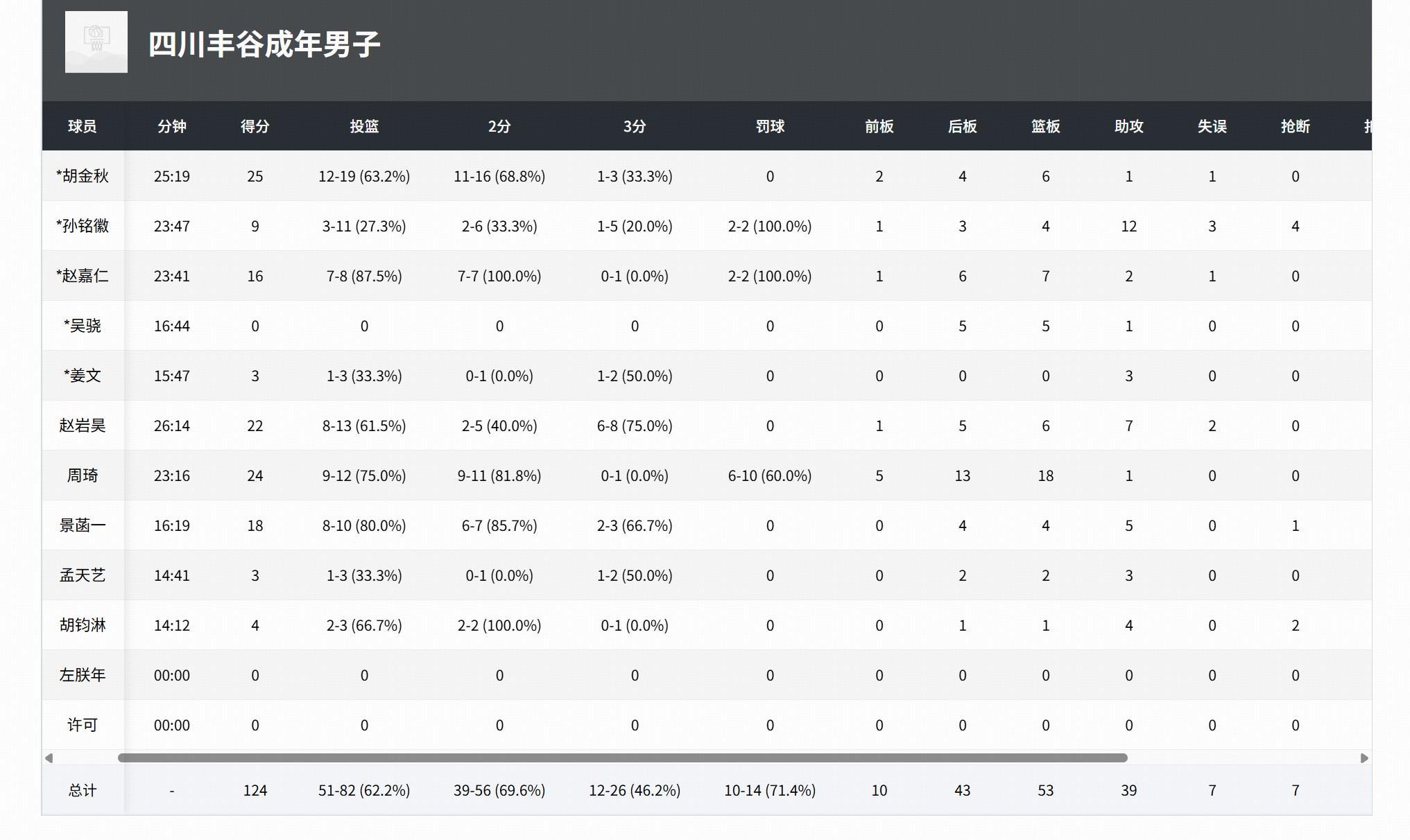 四川男篮方面,周琦和胡金秋的出色发挥成为球队获胜的关键。周琦全场砍下24分18篮板1助攻,在内线展现了强大的统治力;胡金秋则贡献25分6篮板1助攻3盖帽,攻防两端均有出色表现。此外,赵岩昊得到22分6篮板7助攻,景菡一拿下18分3篮板3助攻,赵嘉仁贡献16分6篮板2助攻2盖帽,孙铭徽则有9分4篮板12助攻4抢断的全面数据。