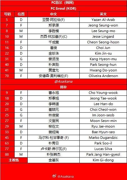 首尔队方面,同样派出了强阵迎战:门将31号姜贤茂;后防线上,16号崔浚、5号亚赞-阿拉伯、40号朴声勋和22号金珍洙组成防线;中场方面,8号李胜模、41号黄度允、7号郑承原坐镇;锋线上,10号林加德首发登场,与11号千成薰、70号奥利维拉组成攻击三叉戟,期待在主场取得胜利。