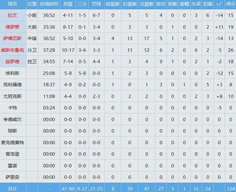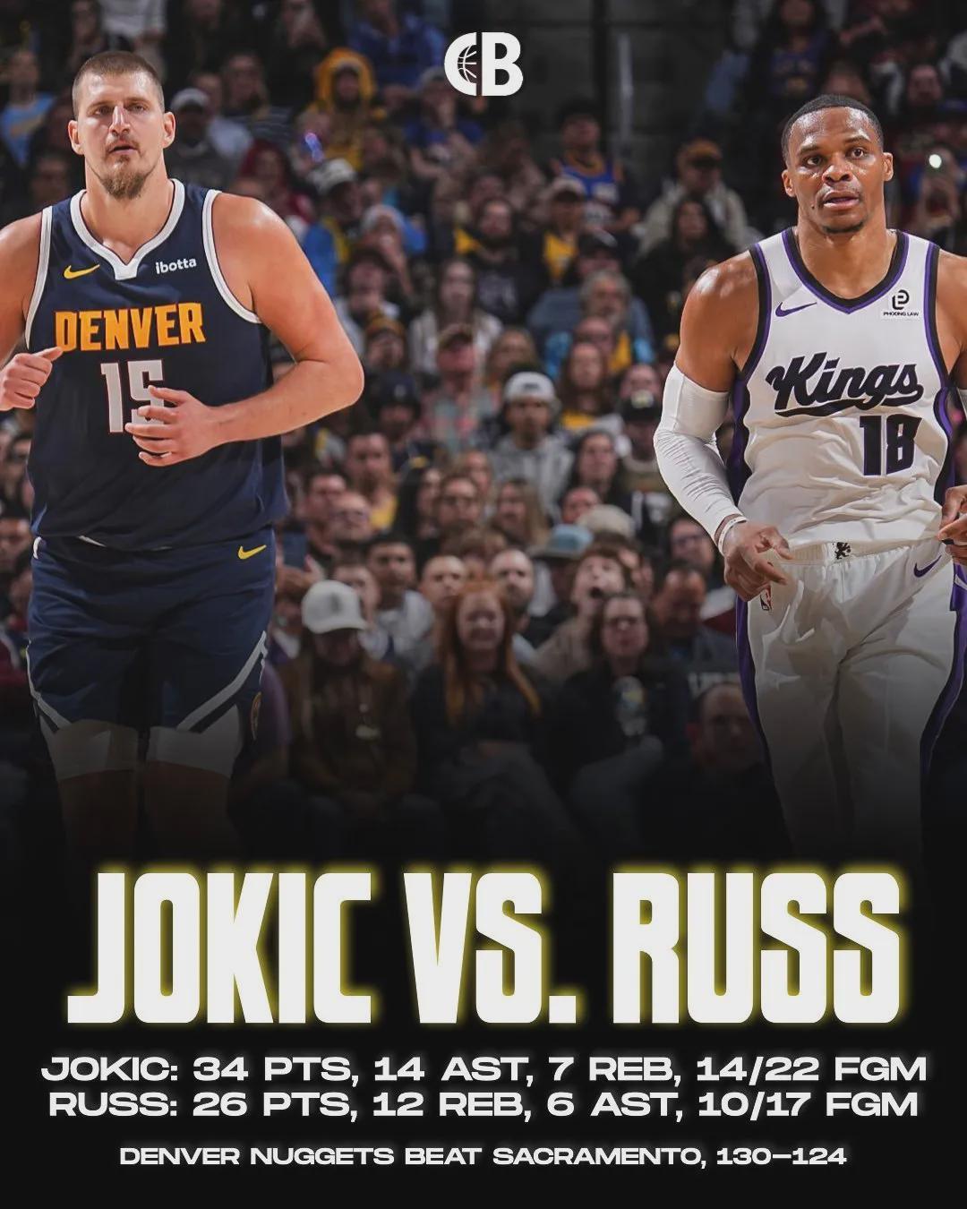 在一场备受瞩目的对决中,国王队以124-130惜败掘金队。然而,本场比赛的焦点无疑是威斯布鲁克(威少)的惊艳表现。他以首发大前锋的身份出战,面对老东家掘金,打出了本赛季最强一战。