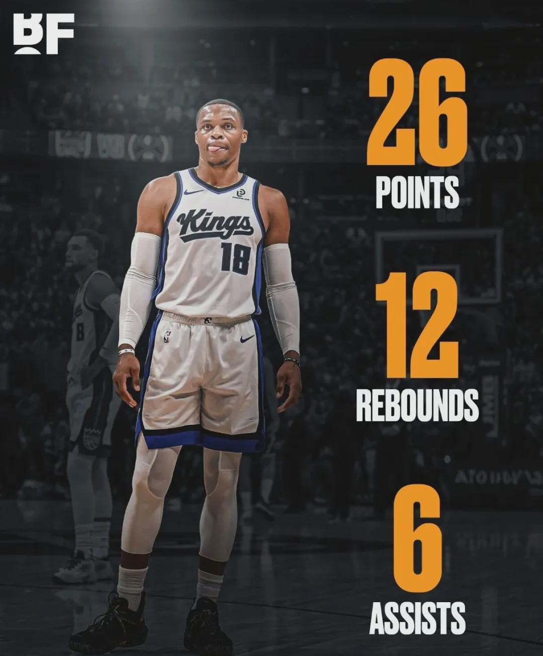 在约37分钟的出场时间里,威少投篮17中10,其中三分球6中3,罚球3中3,砍下了26分12篮板6助攻2抢断的炸裂数据。尽管国王队最终未能取胜,但威少的表现无疑让球迷们眼前一亮。