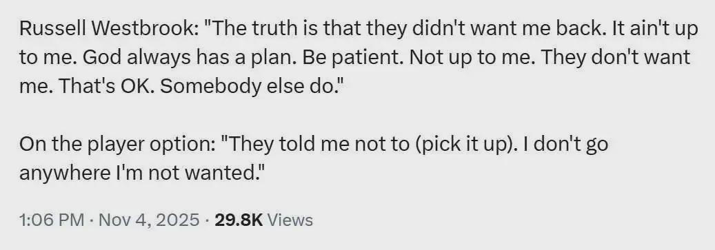 一直有人好奇,威少在今夏休赛期怎么会拒绝执行25-26赛季价值347万美元的球员选项,离开掘金队,转而加盟没有争冠希望的国王队,还只能拿无保障底薪。这样的操作,的确让人摸不着头脑。