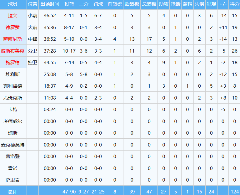 在国王与掘金的一场激战中,国王以124-130不敌掘金,但此役威少的表现却成为了全场焦点。他以首发大前锋的身份出战,面对老东家掘金,打出了本赛季最强一战。在约37分钟的出场时间里,威少投篮17中10,其中三分球6中3,罚球3中3,砍下了26分12板6助2断的炸裂数据,展现出了极高的性价比。
