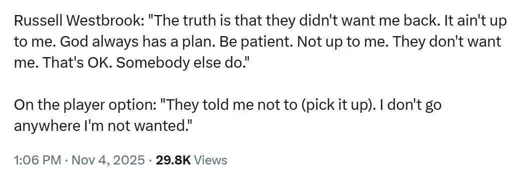 然而,一直有人好奇威少今夏休赛期为何会拒绝执行25-26赛季价值347万美元的球员选项,离开掘金,跑到没有争冠希望的国王,还只能拿无保障底薪。这番操作的确让人摸不着头脑,但据威少本人的说法,是掘金不想让他回来,他也不愿待在一个不需要自己的队伍,所以就分道扬镳了。