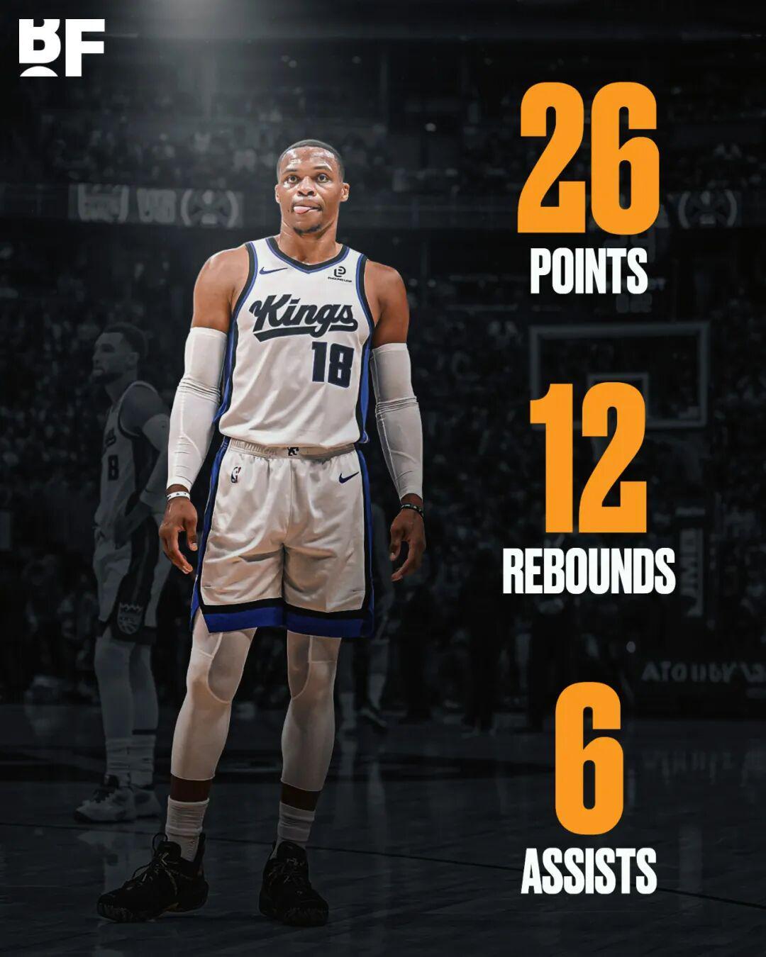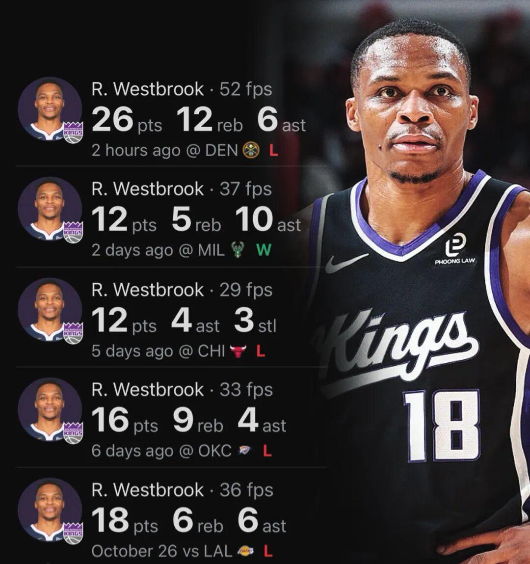 加盟国王至今,威少的表现一直可圈可点。他全勤出战了国王的7场比赛,场均贡献13.9分5.9篮板5.0助攻1.4抢断,三项命中率分别为43.2%/39.4%/70.0%。在过去的5场比赛中,威少更是场均拿到16.8分6.8篮板6.0助攻1.8抢断,投篮命中率44.1%,三分命中率41.4%,展现出了不俗的竞技状态。