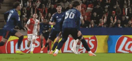第30分钟,阿森纳获得角球机会,加布里埃尔头球攻门时皮球击中防守球员手臂,VAR介入后裁判判罚点球。两分钟后,队长萨卡主罚命中,尽管门将判断对方向,但球速过快导致扑救失败。这粒进球不仅是萨卡本赛季欧冠第2球,更让他成为阿森纳队史首位连续4个欧冠客场破门的球员。