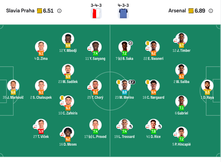 1-拉亚/2-萨利巴、5-因卡皮耶(71’49-斯凯利)、6-加布里埃尔、12-廷伯(71’4-怀特)/16-诺尔高、23-梅里诺、41-赖斯(81’71-阿努斯)/7-萨卡、19-特罗萨德(71’56-道曼)、22-恩瓦内里(65’10-埃泽)