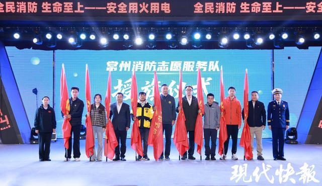 值得一提的是,已连续四年推出的《消防公益说》短片,在今年再添新亮点。活动特别邀请了苏超联赛常州队球员加盟,为消防安全代言,共同向社会发出“安全用火用电”的倡议,旨在进一步筑牢市民的消防安全意识防线。此外,常州工程职业技术学院励志龙舟队、常州市手球协会、常州市足球协会、常州市安全生产协会、美团以及大学生群体等九支队伍,作为消防志愿服务队代表庄严接旗。他们后续将以多样化形式走进街头巷尾,开展消防安全知识普及、应急演练指导等公益活动,让消防安全服务更加贴近群众、融入生活。