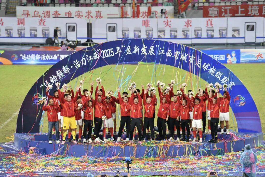 当赣州队全体球员捧起2025年赣超联赛的冠军奖杯,沉甸甸的奖杯代表的不仅仅是绿茵场上的荣誉,更象征着赣南红土地上人民拼搏团结、昂扬向上、充满奋斗活力的城市精神。