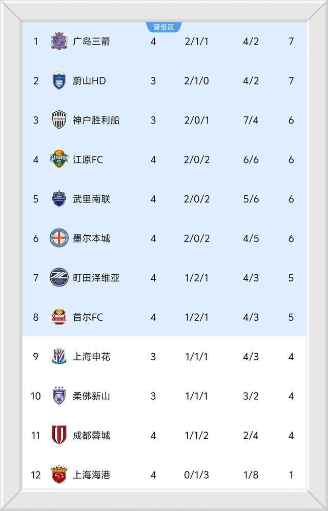 本轮比赛过后,中超两支球队的排名继续尴尬。成都蓉城积4分排名倒数第二,而上海海港仅积1分,依旧在东亚区垫底。武里南联队则拿到第二场胜利,积6分排在东亚区第五。