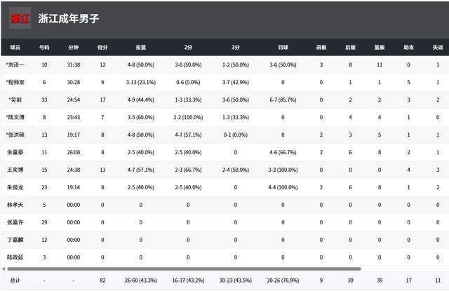 从数据来看,浙江队本场比赛仅用了8人轮转,显然丁伟是志在必得。这8名球员均有得分入账,其中3人得分上双,刘泽一贡献12分11篮板的两双数据,吴前得到17分2篮板3助攻,王奕博则有13分4助攻进账。
