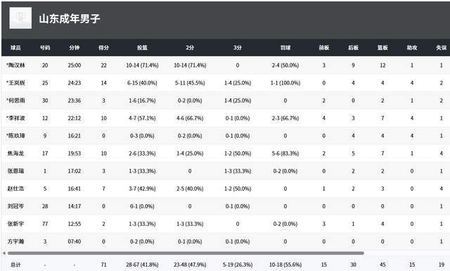 广东队方面,全队11人登场均有得分,徐杰13投9中砍下19分3篮板4助攻,成为取胜最大功臣;赵睿贡献16分3篮板5助攻,贺希宁拿到11分。胡明轩(7分)和王睿泽(2分)手感冰凉,但团队篮球的理念让广东队化险为夷。山东队虽败犹荣,陶汉林14投10中轰下22分12篮板,王岚钦14分4篮板4助攻,李祥波和焦海龙均得分上双。