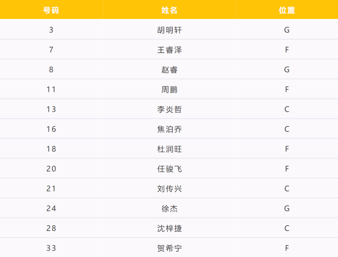 后卫:赵睿、胡明轩、徐杰、贺希宁
