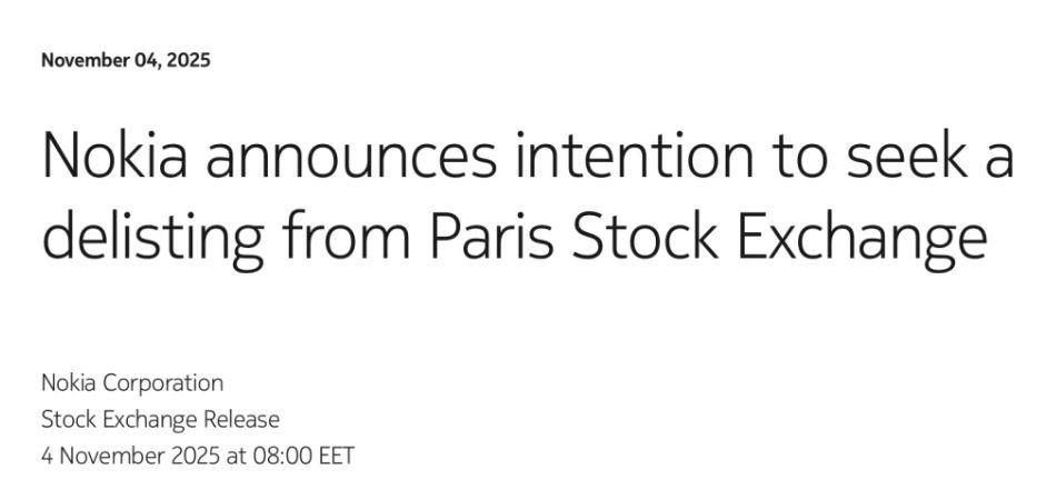 当地时间11月4日,诺基亚官方宣布,公司有意从巴黎泛欧证券交易所退市。