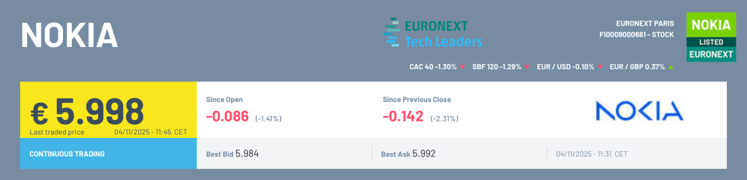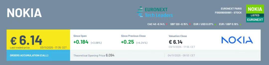 截至11月3日收盘,诺基亚每股报6.14欧元