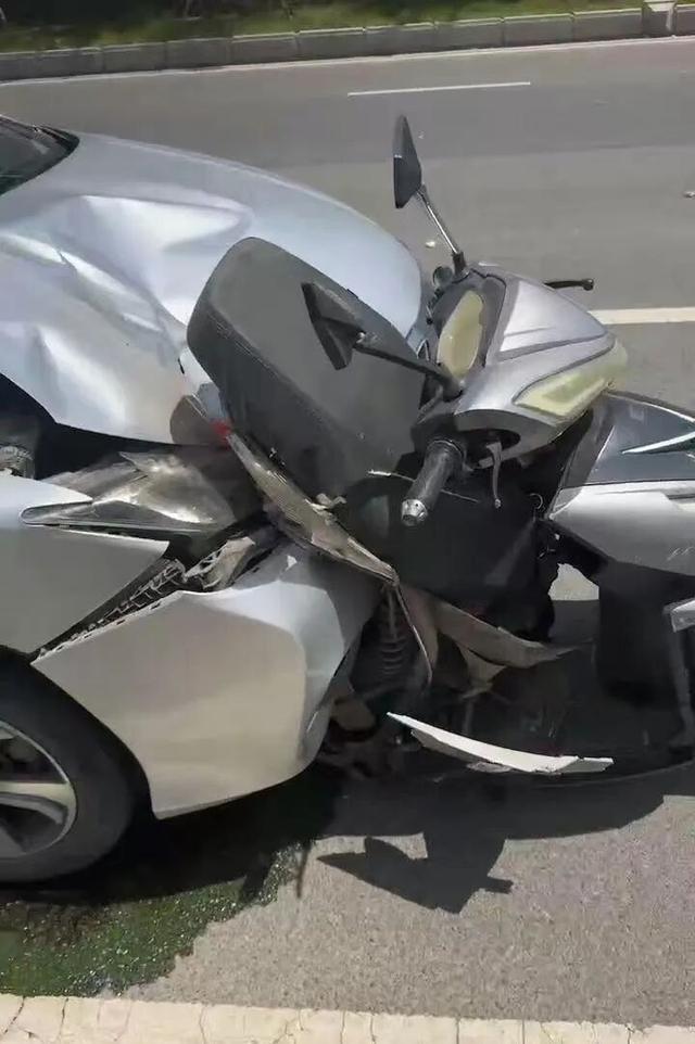 她提供的事发现场照片和视频显示,一辆轿车车头扎进了电动车座椅下方,轿车挡风玻璃破碎,电动车座椅翘起、几乎贴着电动车头,张俊豪趴在两辆车后方地面上。