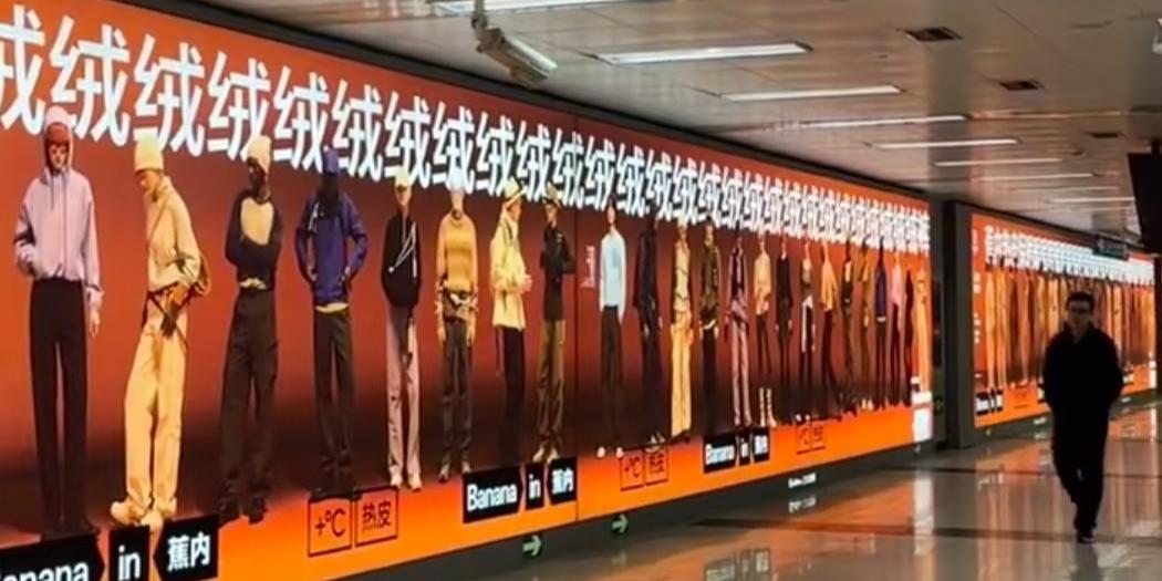 从现场拍摄的图片来看,这则广告以大幅电子屏的形式呈现,画面中展示了多位身着蕉内热皮系列内衣的模特形象,风格写实且具有一定的视觉冲击力。然而,正是这种设计风格,让不少网友感到不适,认为广告内容在地铁这样的公共空间展示过于暴露,观感不佳,甚至有人表示“吓一跳”,呼吁相关方对广告进行调整。