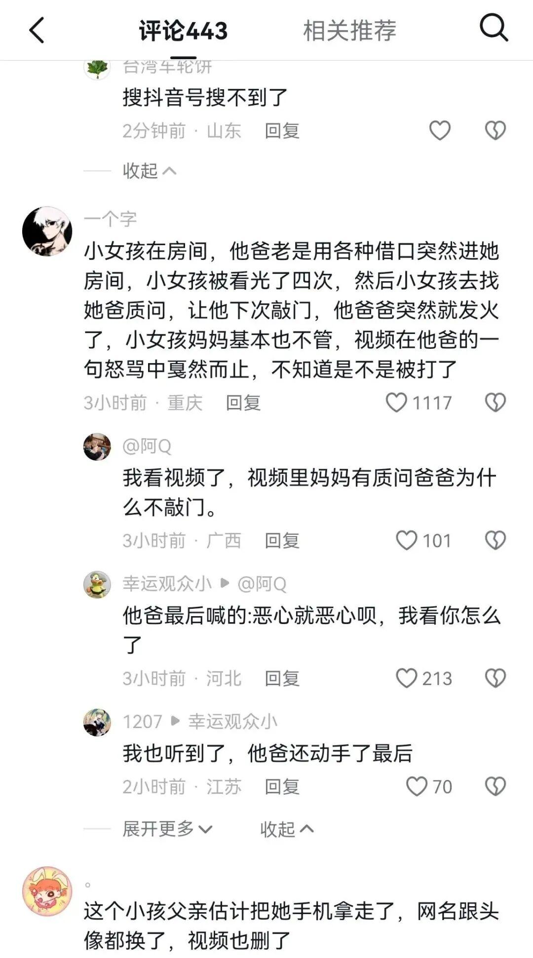 视频中,女孩带着哭腔回忆:"第三次你直接推窗闯入,我不确定你是否看见;第四次我实在忍无可忍,你到底有没有在意过我?"更令人震惊的是,父亲进入女儿房间从未敲门,甚至在女儿换衣服时直接推门而入。当女儿说出"碰你都觉得恶心"时,父亲竟暴怒回应:"恶心就恶心呗,我看你怎么了!"