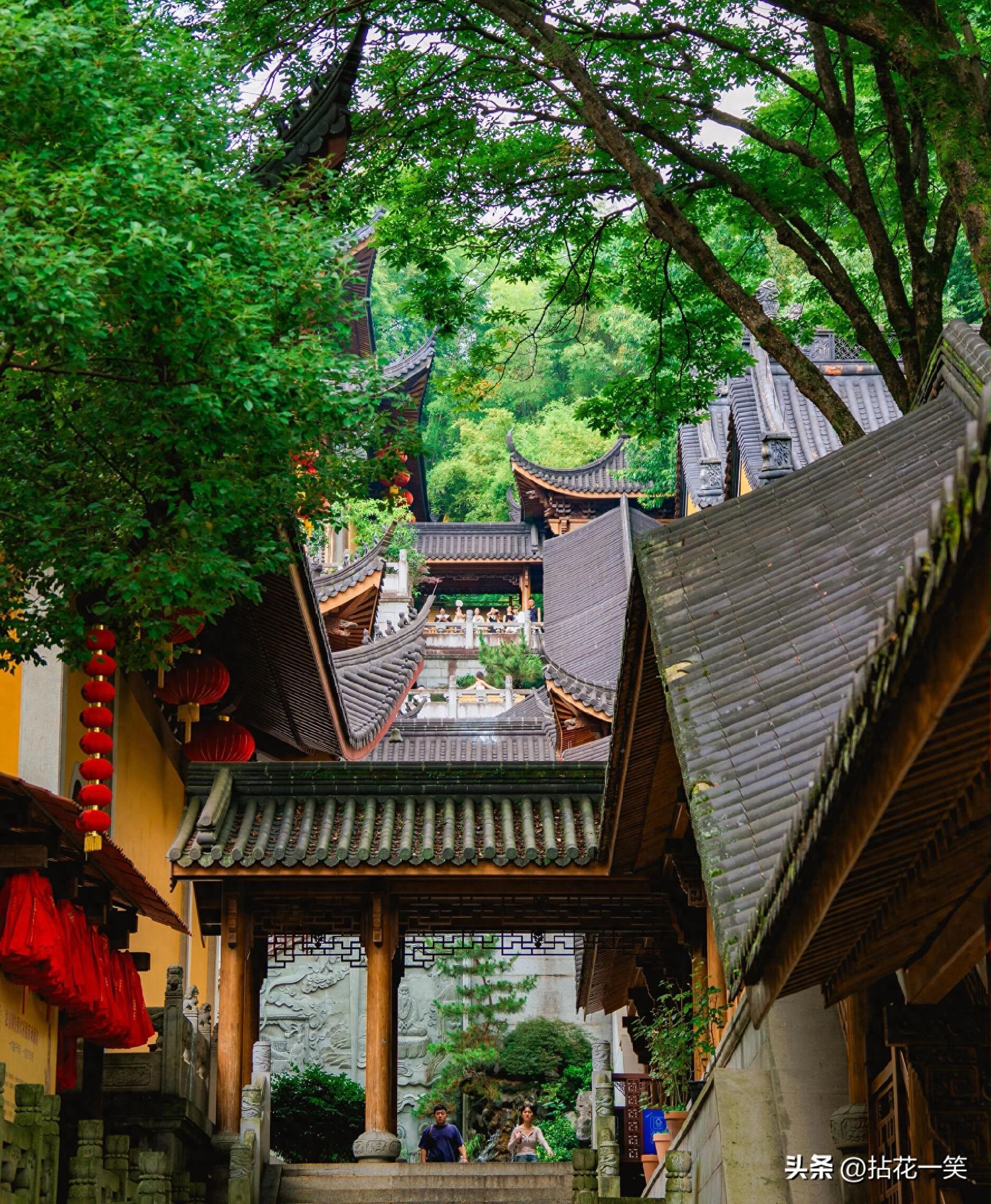 比起灵隐寺的人声鼎沸,上天竺法喜寺更像杭州人私藏的清净角落。清晨6点半的山门最是动人,晨雾未散时,红灯笼在飞檐下晃出暖光,红砖拱门漏进斜斜晨光,白墙竹影被拓成天然水墨画。来自北京的游客站在“法喜寺”匾额下,用广角镜头捕捉飞鸟掠过飞檐的瞬间,直言这种清雅温润的黄墙竹影,与故宫的红墙黄瓦形成奇妙对比,生出别样的治愈感。