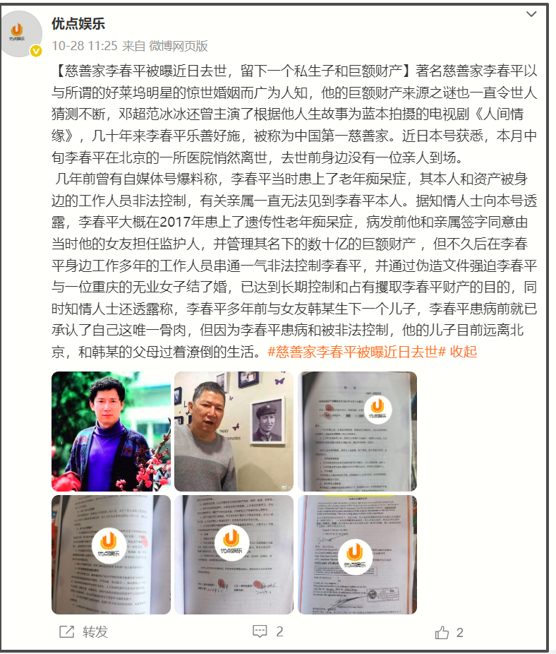 近日,优点娱乐曝出大富豪李春平去世的消息,随即引发了众多与李春平相识人士的纷纷发声。除了自称是李春平孩子生母的网络歌手韩女士外,网红史晓燕也公开谈及了她与李春平的交集,并侧面辟谣了李春平拿下268亿遗产的传闻,这一爆料迅速引发了网友的热议。