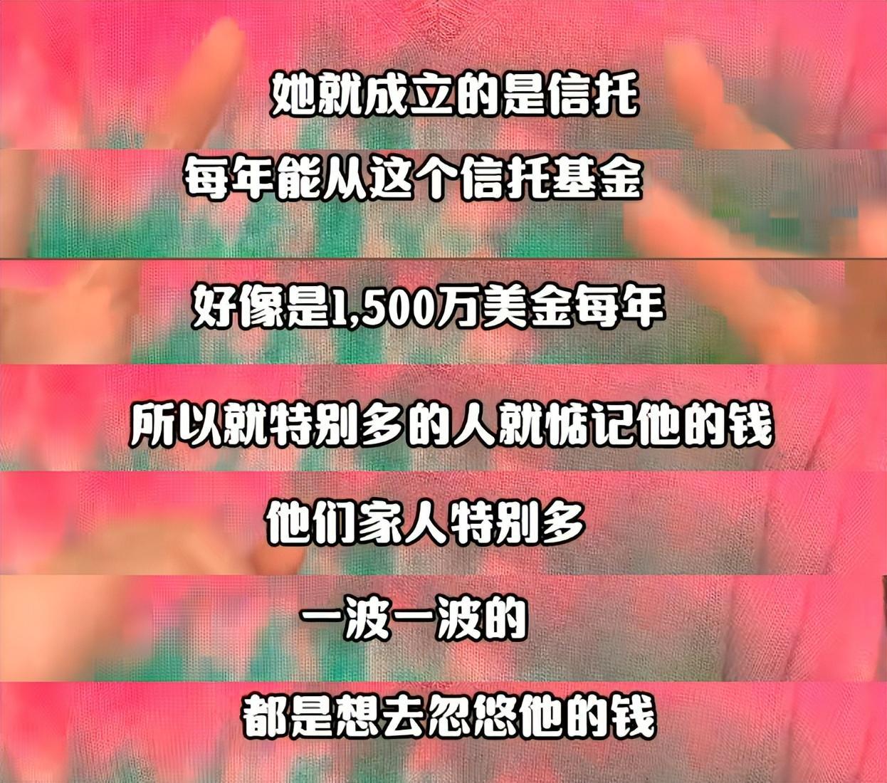 史晓燕透露,李春平年轻时曾与一位好莱坞明星富婆结婚,并伺候对方长达13年。在女明星去世后,李春平确实获得了巨额遗产,但并非网传的268亿美元。据史晓燕称,女明星去世后成立了信托基金,李春平每年可从该基金中领取1500万美金。此外,女星的儿子每年也能从信托中领取一定金额。