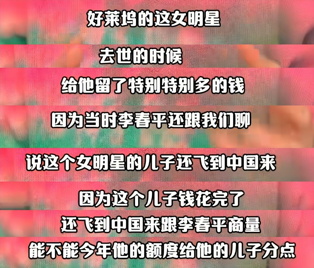 史晓燕还透露了一个细节,有一年女星儿子把当年的额度花完了,还特意飞到中国找李春平商量,希望李春平能分点给他。这一细节不仅揭示了李春平与女星家庭之间的复杂关系,也让人对李春平的财富状况有了更深入的了解。