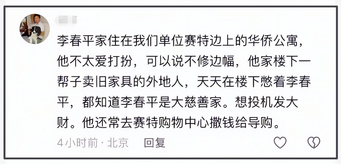 从之前的爆料中,我们也可以看出李春平为人热情善良。他带着钱回国后做了很多的慈善,很多人找他帮忙基本上都是有求必应。一位北京IP的网友透露,李春平就住在自己单位附近的华侨公寓,他不修边幅很随性,经常去购物中心给导购撒钱。还有网友透露自己是李春平的老战友,当年孩子在北京贷款300多万买房,经济十分拮据。李春平知道后,主动帮孩子还了贷款。