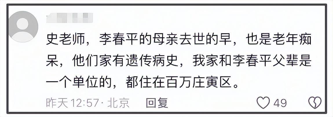 尽管李春平的巨额财富来源一直有人怀疑,但毋庸置疑的是他是一个大善人。只可惜李春平晚年饱受病痛折磨,还被曝在2017年患上老年痴呆。史晓燕认为李春平之所以患痴呆,是因为财富自由后吃好喝好耽于享乐。但知情人士透露,李春平的痴呆很有可能是遗传,因为李春平的母亲也患有老年痴呆,有家族遗传史。