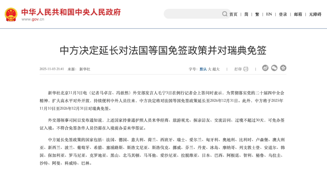 根据最新公示,此次延长涵盖包括澳大利亚在内的多国,如法国、德国、意大利、西班牙、瑞士、荷兰、新西兰、日本、韩国、挪威、芬兰、丹麦、葡萄牙、希腊、巴西、阿根廷、沙特等40多个国家。与此同时,中国还新增了瑞典为免签国家,自2025年11月10日起至2026年12月31日实行单方面免签。