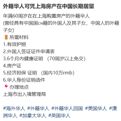 针对希望在中国长期居住的外籍华人,部分地方政府也推出了更具灵活性的政策。以上海为例,目前符合条件的外籍华人可通过购置房产等方式申请长期签证。这也算是变相实现两边畅通无阻了!