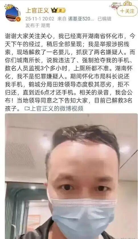 当天下午,上官正义再次发文称,他中午协助警方解救了婴儿,并抓获了两名嫌疑人。然而,怀化市城南派出所所长却指责他违法,强制收走了他的两部手机,并派人专门看管他,限制其自由。他呼吁大家关注此事。