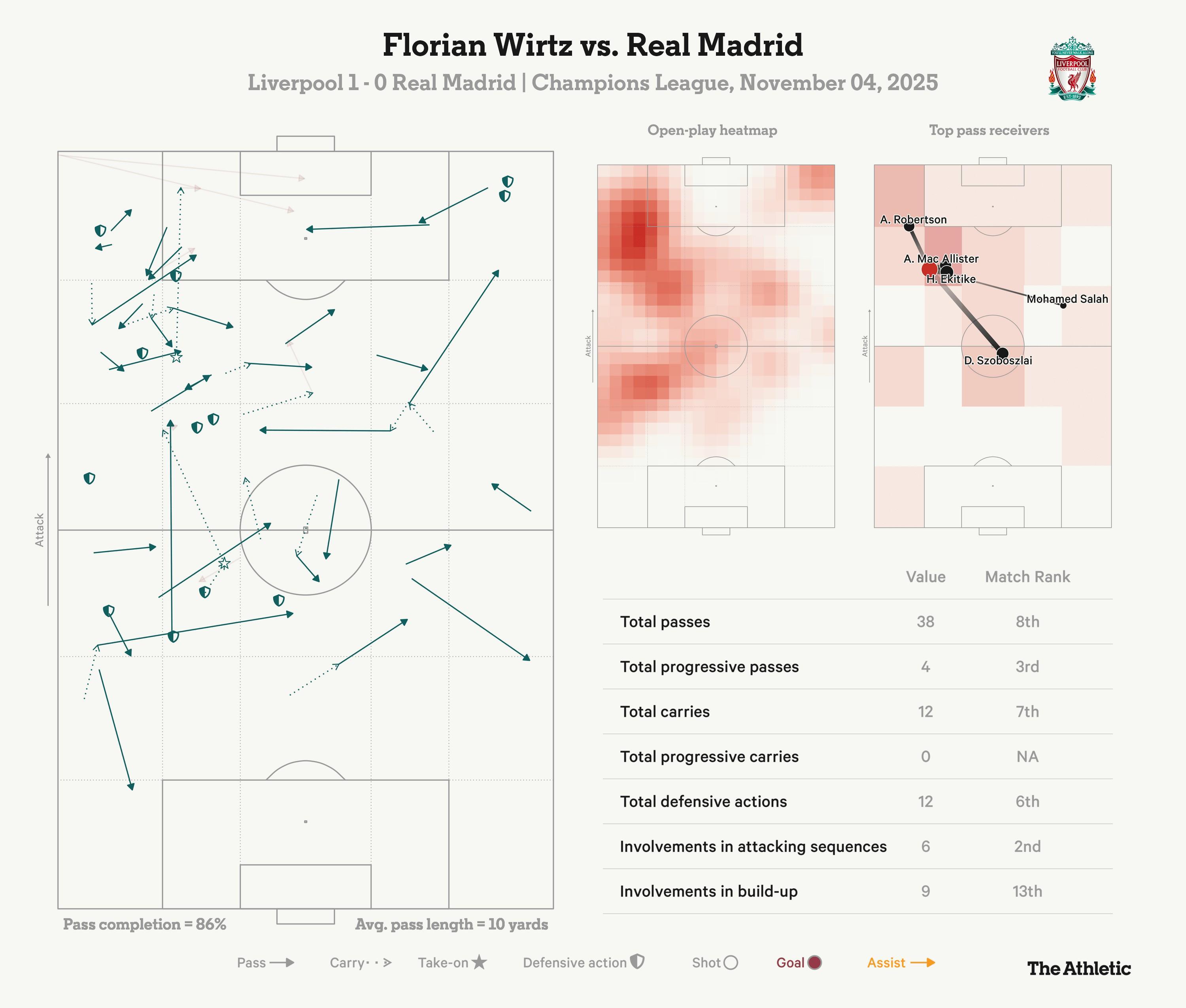 上半场,维尔茨的表现堪称惊艳:第10分钟,他追向角旗区抢断赫伊森,与索博斯洛伊配合为麦卡利斯特创造机会;第17分钟,一次漂亮的触球在反击中释放埃基蒂克;第26分钟,他断下卡马文加的球并做给麦卡利斯特;第27分钟,沿右翼冲刺后完美的倒三角回传为索博斯洛伊创造机会;第36分钟,在皇马禁区外与埃基蒂克完成撞墙配合……这些动作虽不惊艳,但每一个都充满巧思,且以快速有力的节奏完成。在上半场的高水平对抗中,维尔茨制造的创造性威胁超过了任何人。