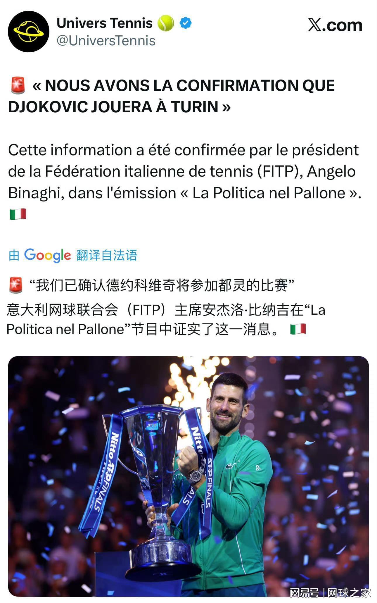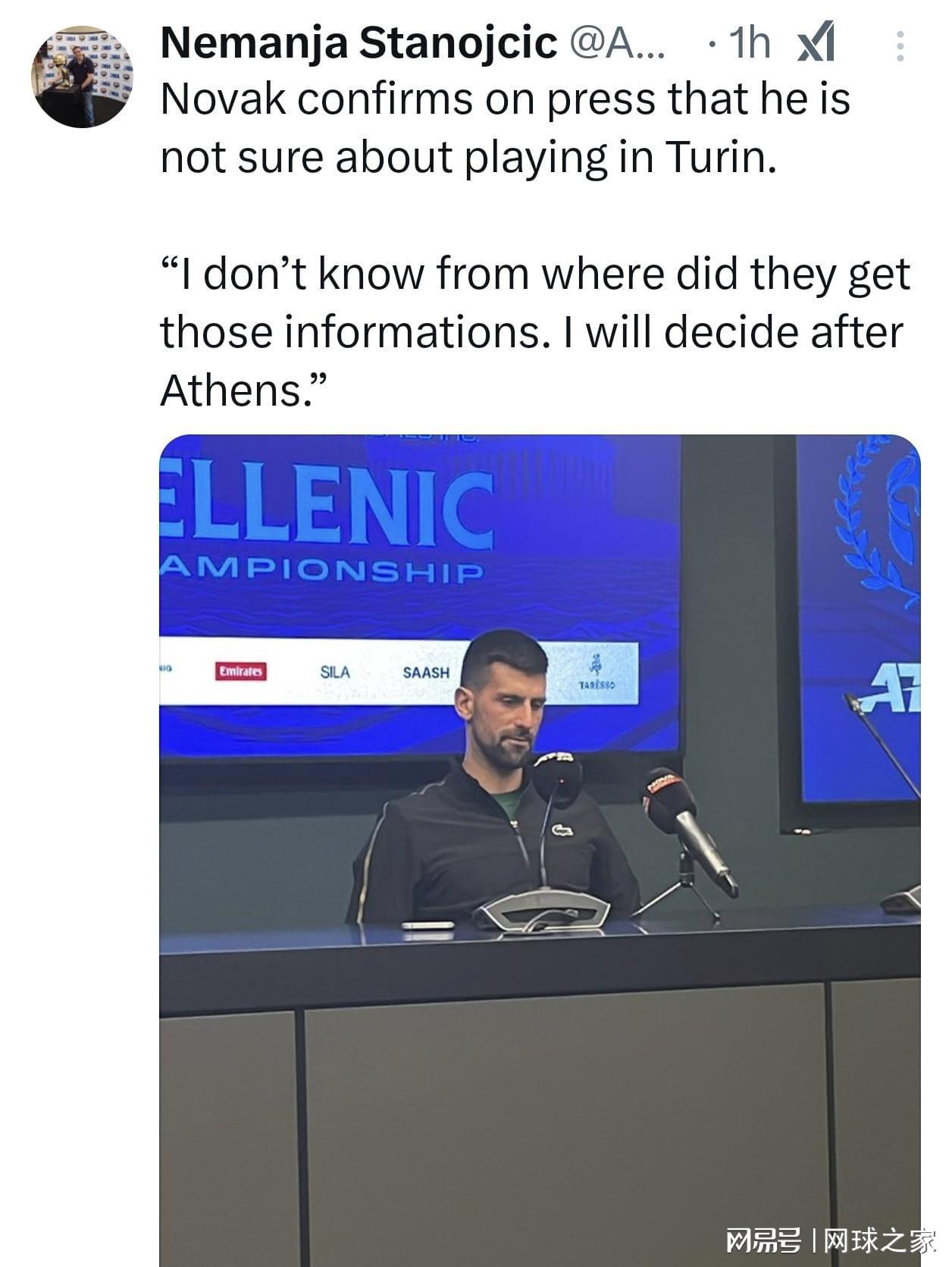 然而,赛场外的另一则消息却为德约科维奇的后续行程增添了一丝悬念。雅典站开赛前,意大利网协主席比纳吉在接受采访时确认,德约科维奇今年将重返都灵,参加年终总决赛的角逐。