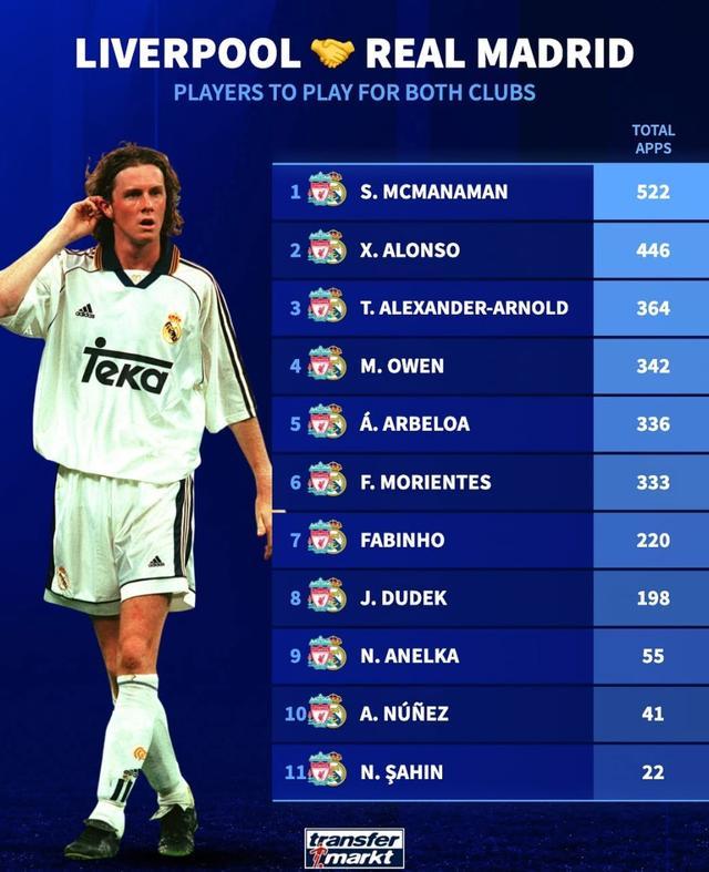 曾效力过利物浦和皇马的11名球员出场数排名: