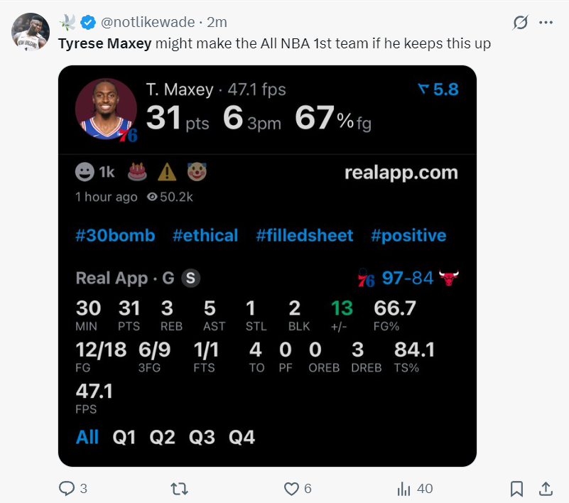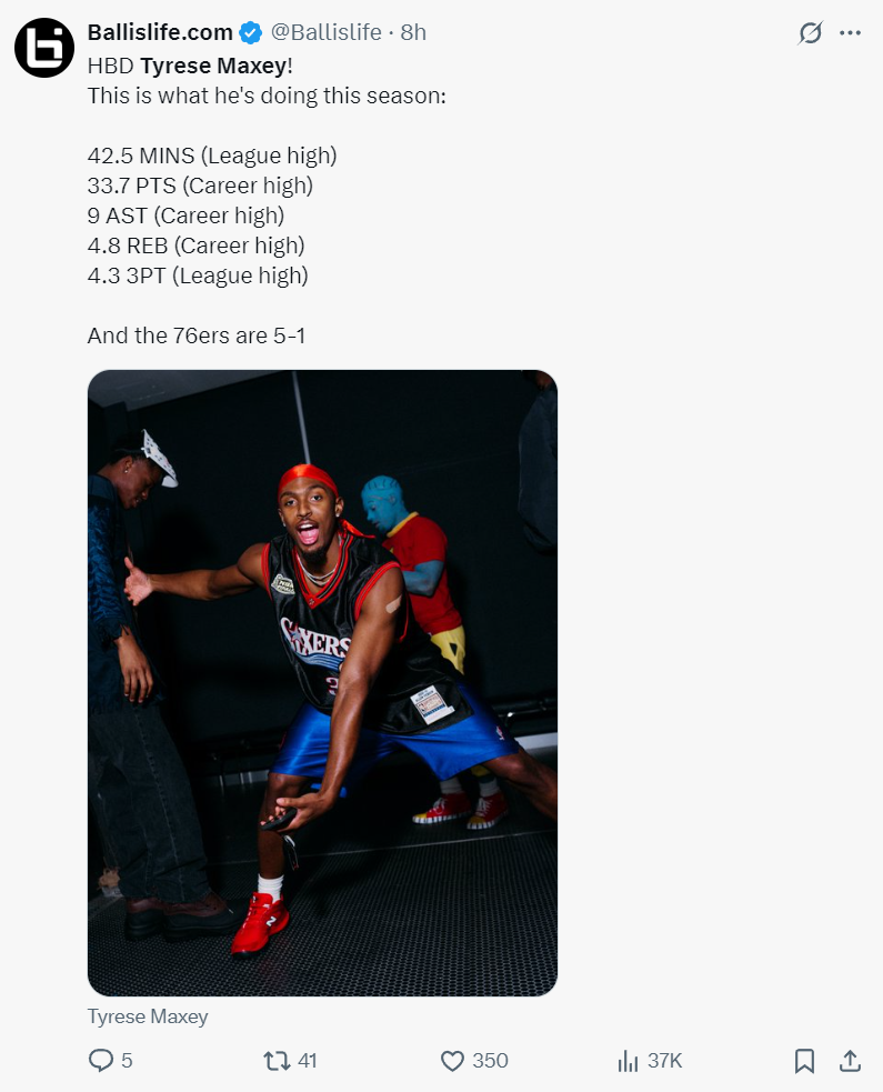 这场比赛恰逢76人核心泰里斯·马克西的25岁生日夜。开赛至今,这位年轻后卫状态火热:前6战场均出战42.5分钟,贡献33.7分9助攻4.8篮板,场均命中4.3记三分球。其连续6场25+的表现,更比肩2005-06赛季的传奇球星阿伦·艾弗森。
