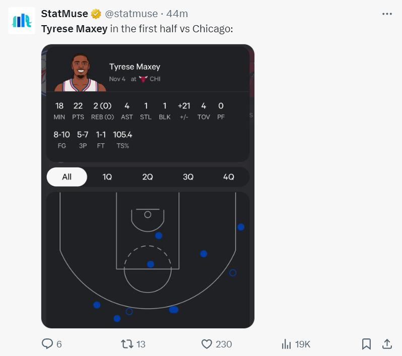 生日夜的首节比赛,马克西便展现惊人效率:上半场出战18分钟,10投8中(三分7中5),狂砍22分4助攻2篮板1抢断1盖帽,命中率高达80%,真实命中率达105.4%,正负值+21领跑全场。其无解的进攻表现,一度让76人建立24分领先优势。