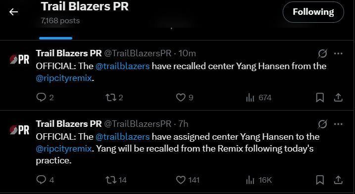在今日早些时候,开拓者队官方宣布将杨瀚森本赛季第二次下放至G联赛下属球队撕裂之城混音队。球队方面同时表示,杨瀚森在完成今日在混音队的训练后会被召回。这一安排显示出球队对杨瀚森训练状态的密切关注。