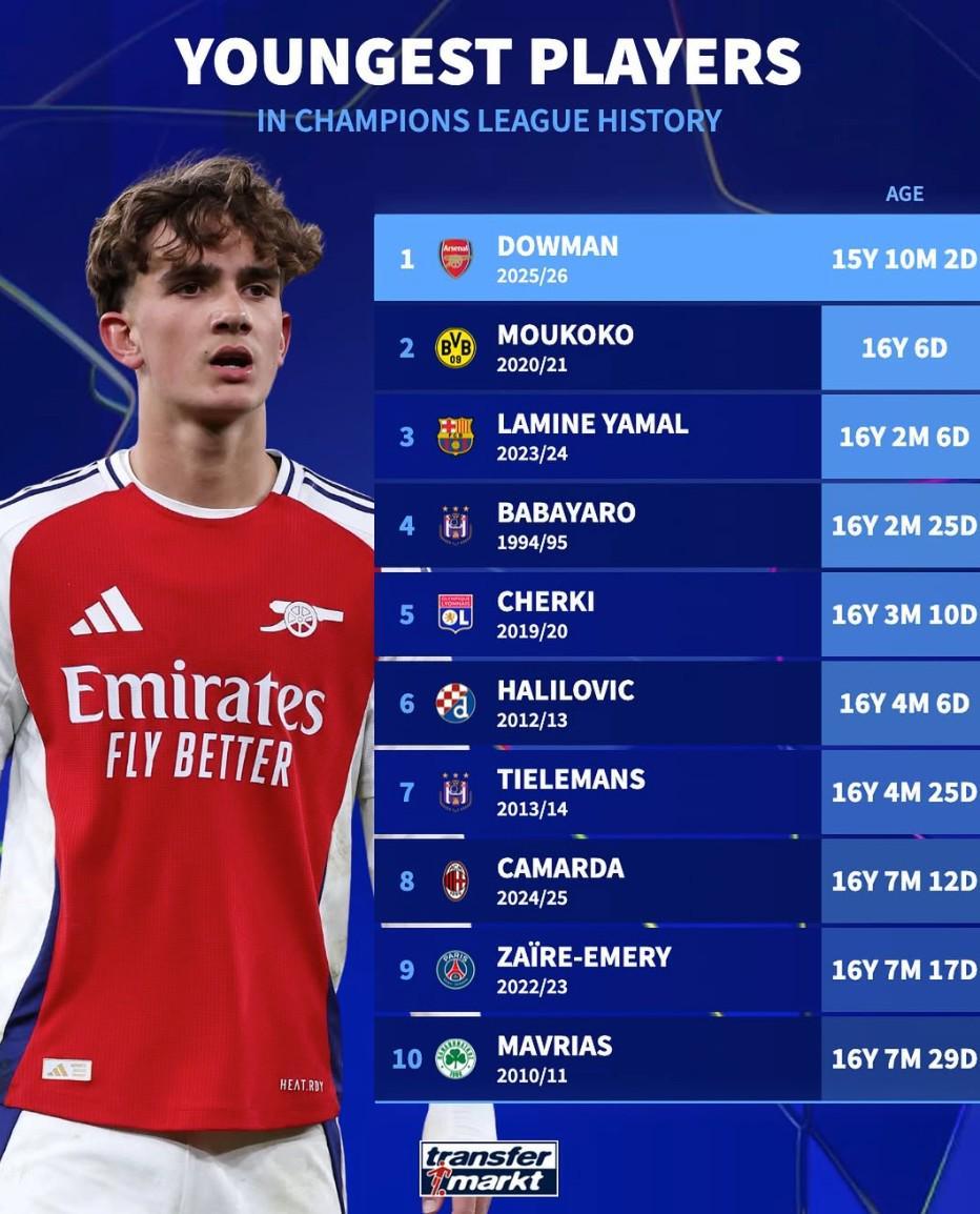 在阿森纳与布拉格斯拉维亚的比赛中,道曼以替补身份完成欧冠首秀,成为首位未满16岁即登场的球员,其年龄纪录较原保持者穆科科缩短近8个月。