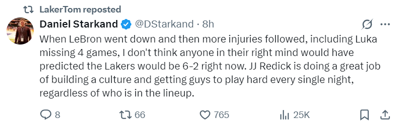 美国记者丹尼尔-斯特瑞克表示,在勒布朗因伤无法出战,随后湖人又遭遇伤病潮,就连卢卡也缺席了4场比赛的情况下,没有人料到湖人能够取得6胜2负的战绩。雷迪克打造了一个全新的团队氛围,他激励球员每晚都全力以赴,无论阵容如何变化,球员们都能保持高昂的斗志。