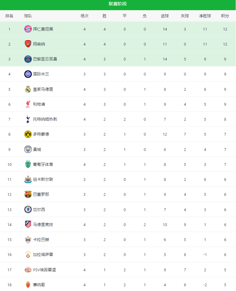 欧冠最新积分榜:阿森纳升至第二,多队竞争激烈
